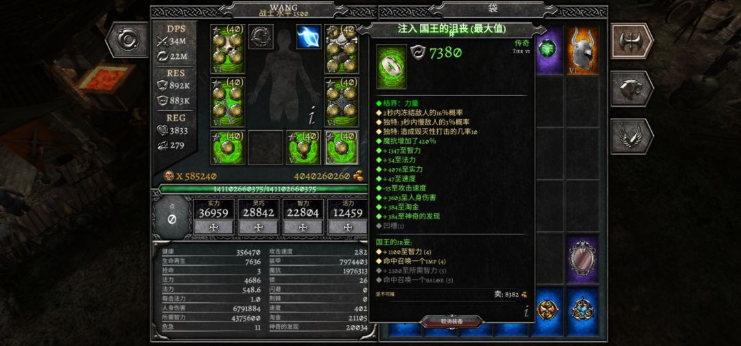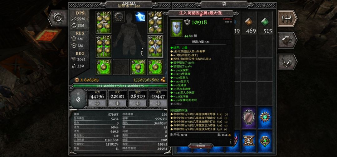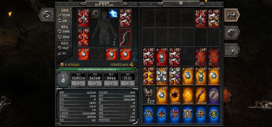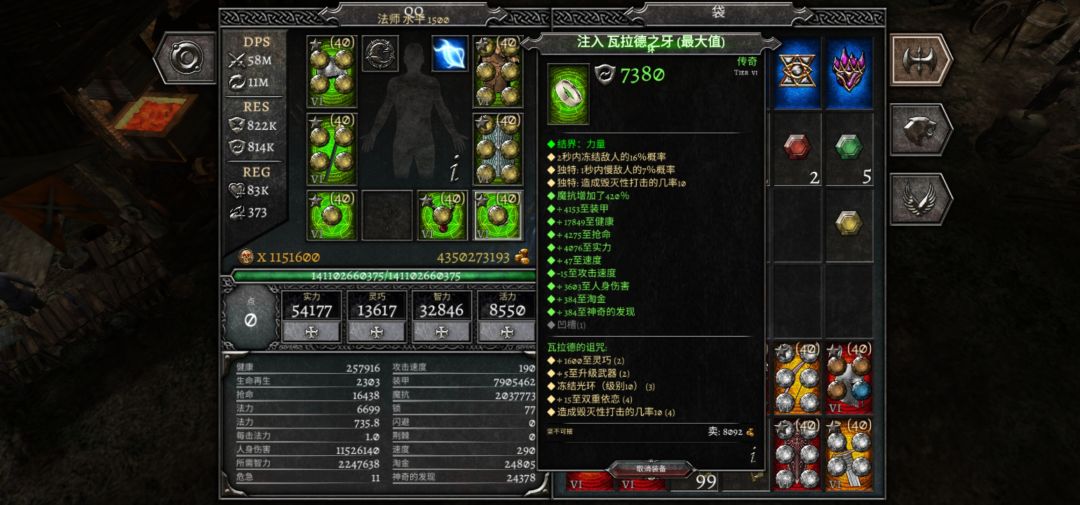 接着是第二套,毁灭套+MF首饰两件套和贪婪匕首,喂1断头台5毁灭大剑1死亡镰刀,由于我懒得换装,就用老图雷电法杖了(不能触发毁伤),也就是说此图MF要加640X加成,大约就是25800左右吧,这套好处就是MF高