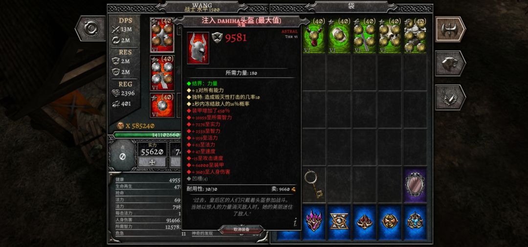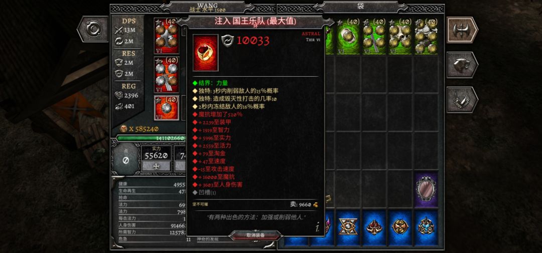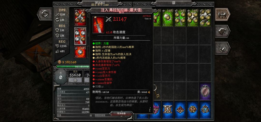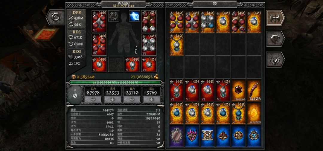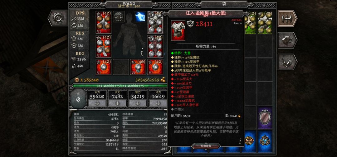 左手恶魔喂星剑,剩下6个位置有4个是秀逗喂混沌,2个是恶魔喂混沌,卡好后取下星剑再带起来,这样就用星剑的天赋,卡的时候一把混沌烈焰镶嵌宝石是1魔抗+5物抗,用上述所说附魔,也就一百四十几万M这样吧