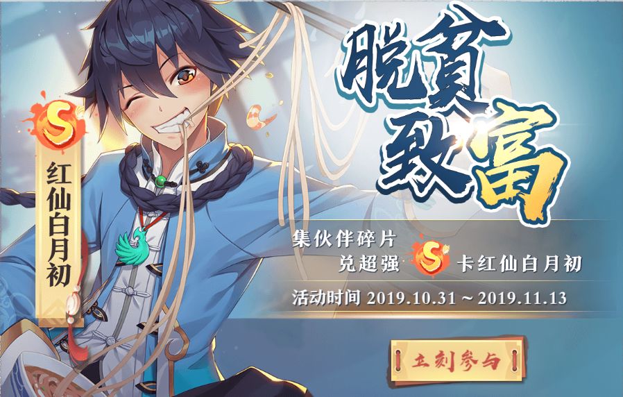 在2019. 10.31-2019.11.13,在H5活动页面上通过转盘收集伙伴碎片,达成活跃数后,每日最多可抽取4次。集齐7张碎片即可兑换“红仙白月初”,抽取相同的碎片还可与亲友互换。