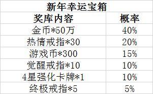 活动内容:活动期间登录游戏,即可领取新年幸运宝箱。奖励将直接发送至游戏邮箱!宝箱奖励新年全面大升级!