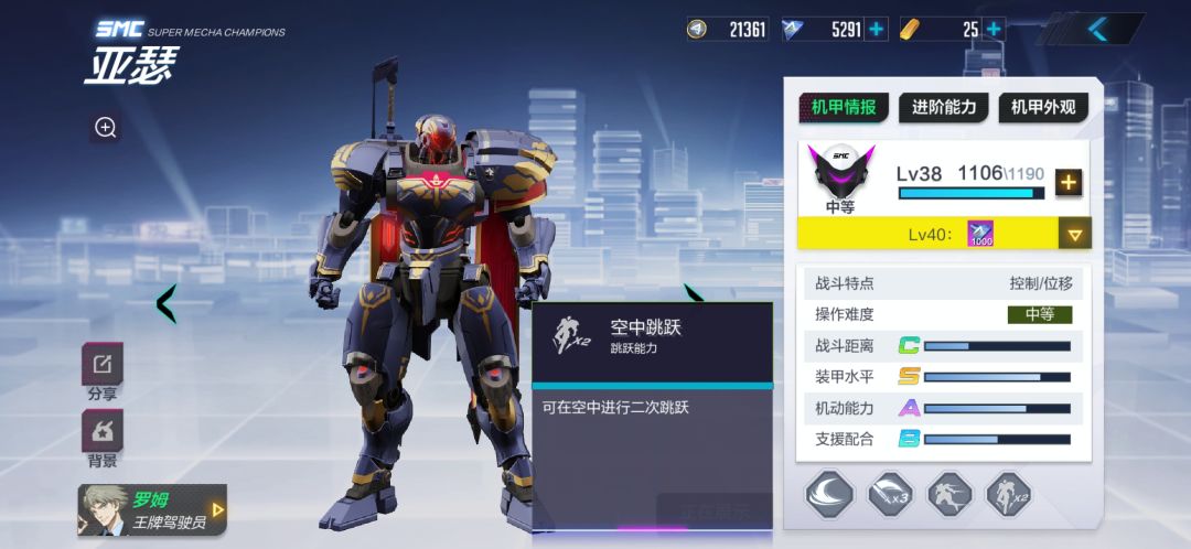 主动技能:战术突进,启动背部推进器,实现短距离的突进(战术突进是拉近敌方距离或拉远距离的主要位移技能)