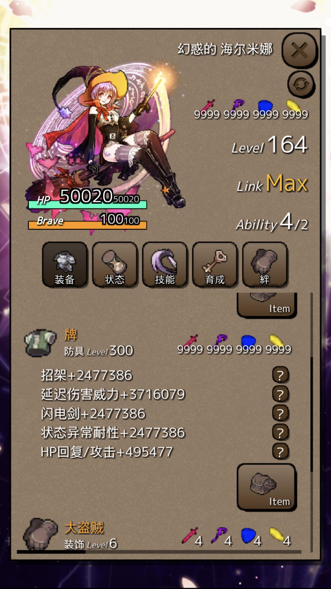 这里就利用到游戏的另外一个机制,数值类词条(例如招架+113、出血+26)等会随着装备等级的提升而提升,通过在装备上打造对应词条后快速提升装备等级的方式,可以将对应词条效果提升(装备等级在突破某些阶段时数值及词条数值会提升幅度会大增,例如120级、200级、290级)。在装备升级为满级300级时,词条属性高达百万,虽然实际打起来没这么夸张,但也达到了该词条属性在游戏中的上限。经实际测试Brave类(捕手、法力节约等上限为5)、雷电剑等实际伤害封顶为99999。状态异常耐性、招架、回避等上限未知(没被打中过,没法测,99.9%?)。