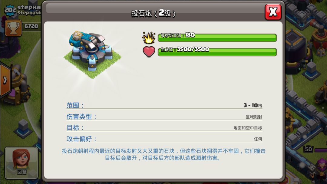 可以看到这个闰王非常的强大,不仅伤害高,而且优先攻击防御,还能跳过城墙,无愧于战神的称号,技能是锁定的,有点类似于电龙的攻击,但伤害更高,仅仅是这个英雄,就有很多玩家在联赛结束后用锤子秒了大本营(我就是其中一个) 十三本第二个亮点就是新建筑——投石炮!