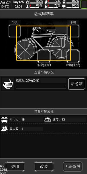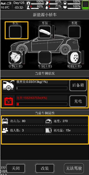 中间会显示车辆的后备箱与油箱信息,而下方为车辆当前属性。