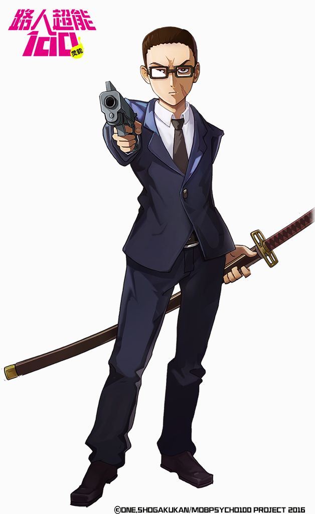 樱威在路人百分百里面是一个西装革履,戴着一直在反光的眼镜,梳着彰显成熟的大背头,脸上残留着公开处刑的伤疤的成年人形象。