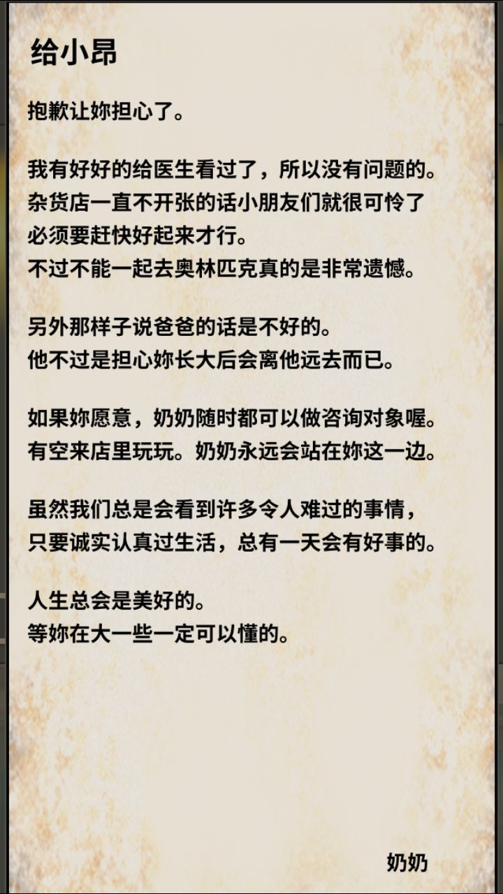游戏故事的最后,小昂也成了奶奶,也同样拥有了一间普通的杂货铺,东京又成功申办了32届夏季奥运会,虽然还有六年,但小昂的孙女早早就发出了邀请。小昂即期待又怀念,日子仿佛回到了四十年前的夏天,故事的起点,叽叽喳喳的小昂缠着奶奶要一起出游,童年的欢笑声在耳边回响。