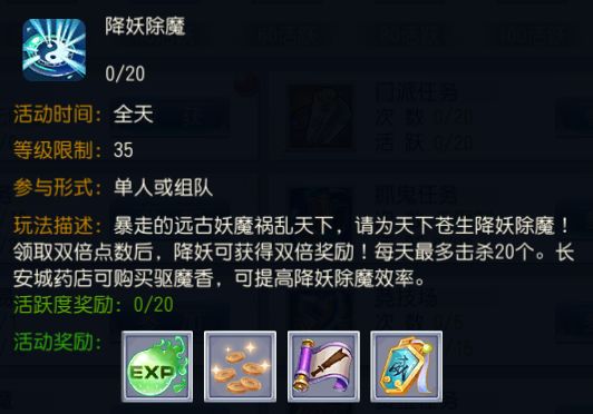 参与方式:点击“日程→降妖除魔”前往或飞到指定场景击杀远古妖魔