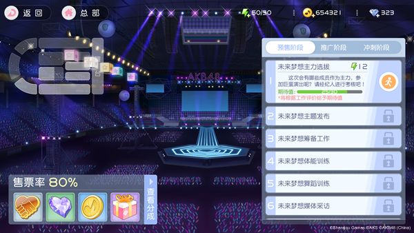 而巨蛋一直也是我们养成、经营的终极测试环节。巨蛋公演随主线剧情及里程碑开放。目前巨蛋公演是不可复刷的线性体验,开启一次巨蛋公演,需要完成三个阶段的筹备工作(预售阶段、推广阶段、冲刺阶段),当玩家完成三个阶段的筹备工作后,巨蛋公演的上座率会达到100%,并开启巨蛋公演。