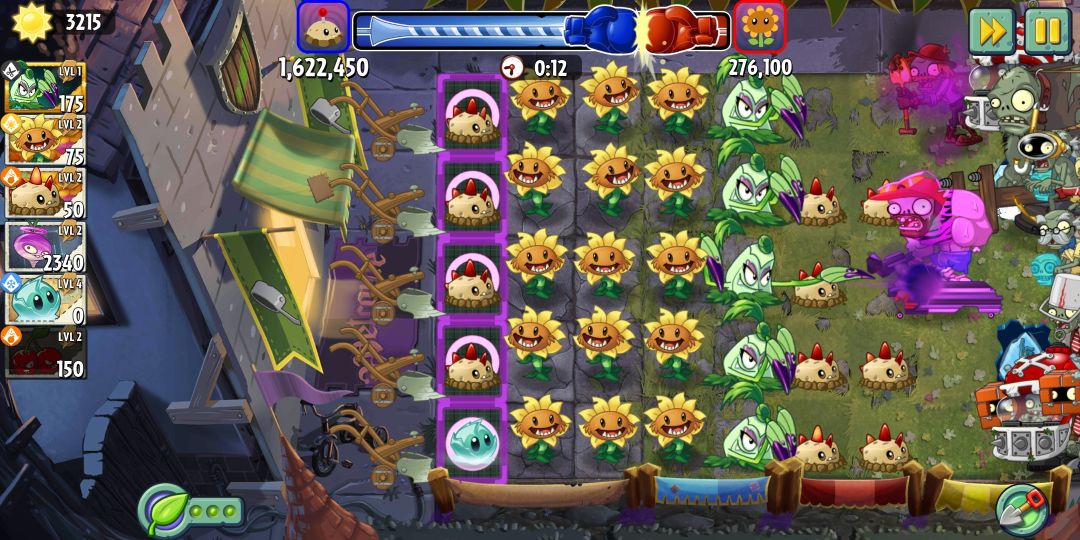 战斗阶段,优先在4排种向日葵,1排瓷砖可以同时种,还可以抽空在第三行放一个联赛给的植物,阳光绝对够用,种到四个瓷砖阳光就跟不上了,不过这个时候就可以放大招了,瓷砖要保证覆盖到1个冰冻生菜和3个原始土豆雷,放一两轮大招,期间把1排最后土豆雷准备好,阳光到位放下第五块瓷砖,彻底成型了,不失误的话上150万应该没什么问题