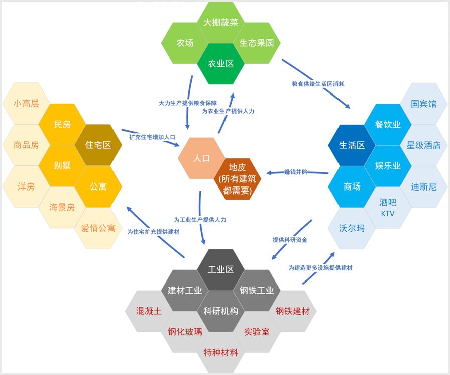 从人类扩展就划分4个发展方向(可能并不完善,有待补充细化),最初期的农业发展,然后工业发展,人类基本的住宅,还有生活的周边设施。