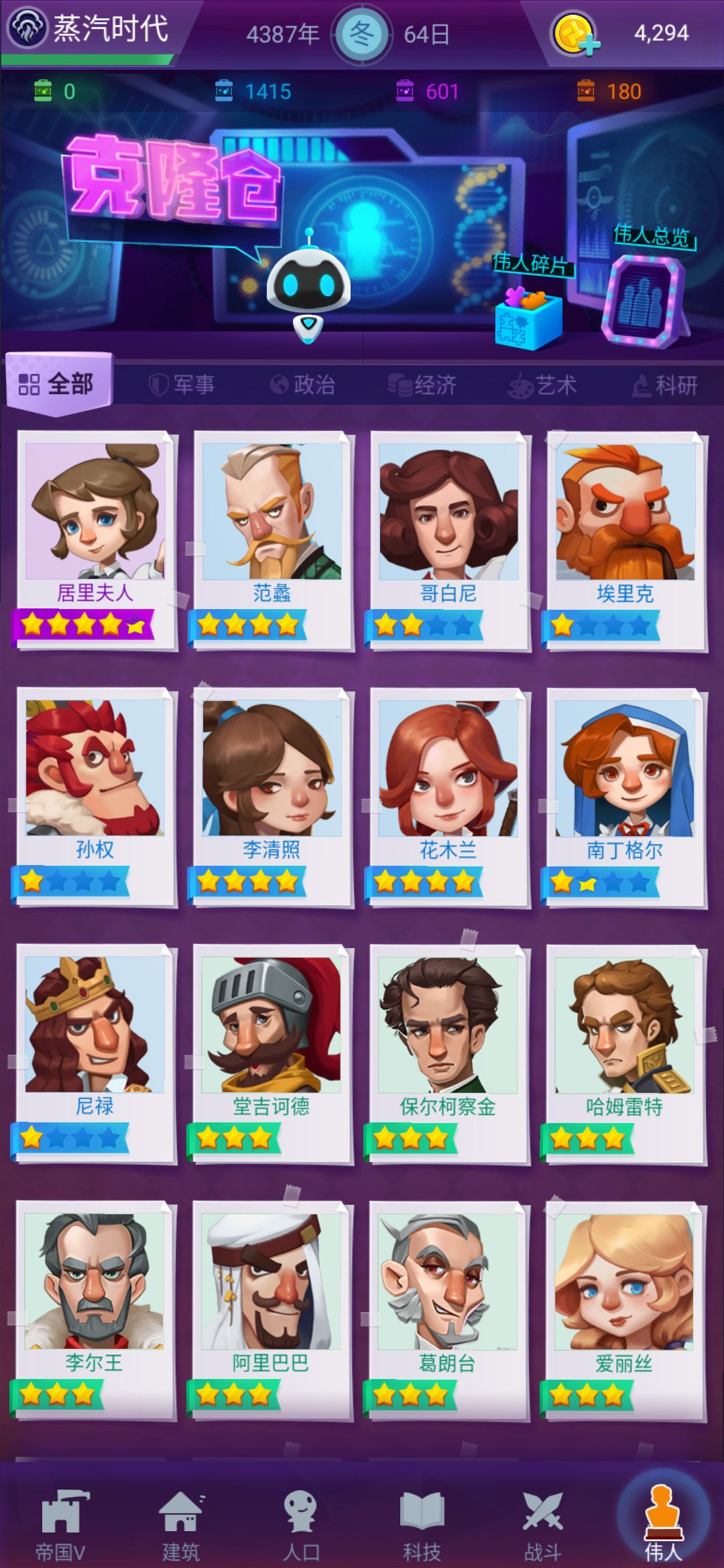 伟人分为绿色,蓝色,紫色。橙色,以后会不会有红色什么的就不做猜测了,伟人不管什么颜色都有用我个人建议从绿色升起,不一定非要狂抽弄橙色。你可以理解为橙色属于加强版,绿色依旧有用。有些橙色在某些方面不一定比绿色好,不充钱的可以每天点赞领一个抽,喜欢游戏的可以双永久加月卡也不贵200不到每天3张,合计每天4张。可攒着做周任务,也可以不攒着抽着过瘾,不过最好10连抽。10连抽必给紫或橙色。多多益善。个人推荐绿色升满先把埃及小妹升级可以增加金字塔的收益满级应该是55金币每天。别的随着时间慢慢升,战争伟人多多益善。总之就是伟人不嫌少,越多越好,不得不说,这次更新确实给游戏增加了相当大的活力。祝大家多多出橙色![[嗒啦啦2_优秀]](https://img-tc.tapimg.com/market/images/bbb6da13ee1c31ee1405e261f12f366e.gif)