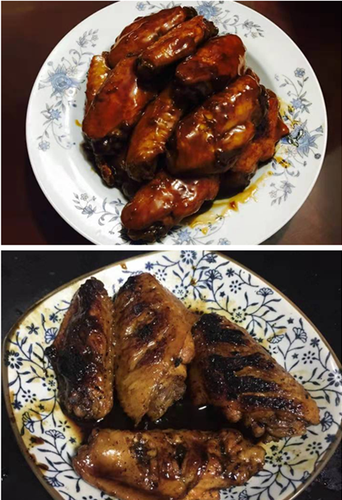 于是楼主兴致勃勃的把蜜汁烤肉料啊,盐啊,耗油蜂蜜啥的材料全部加到一起,然后把鸡翅放进去腌制,楼主还特别耐心的等了一天才把他放烤箱去烤,可是当楼主打开烤箱的时候瞬间就惊呆了!!有没有小伙伴要见证奇迹的??不要眨眼啊!!!!卖相不错吧!