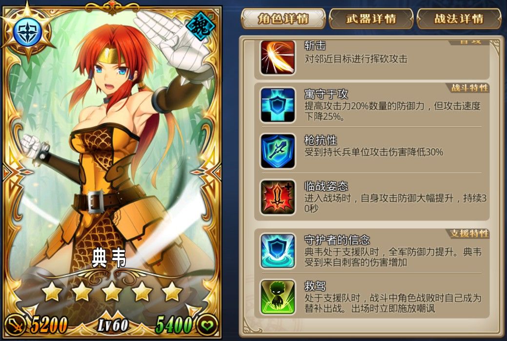 典韦是个强力的支援型角色,救驾的嘲讽配合她自身的高攻高防,既能对敌方脆皮造成威胁,也能吸收大量的伤害。必杀技带有的不死特性,使得她在敌方没有持续伤害时依旧能空血挺立。可观的硬度和独特的不死能力让她在副本或首领战中容错率极高,能够替身板脆弱的队友们吸收大量的伤害,为队友提供良好的输出环境。