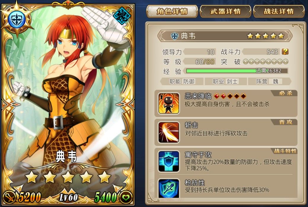 活动内容:恶来降临!通过活动可获得五星防御角色——典韦。活动结束至7月21日仍可兑换活动奖励哦。 典韦卡面以及技能