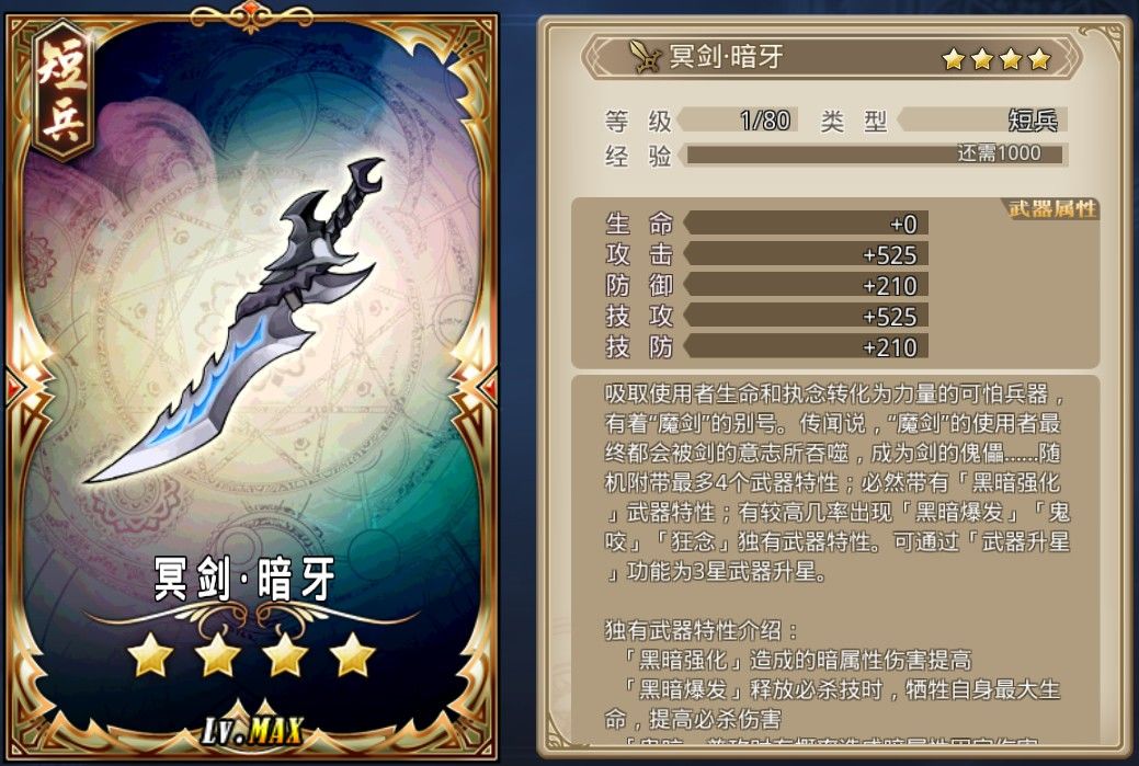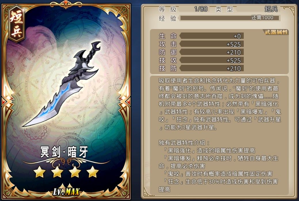 随机附带最多4个武器特性;必然带有「黑暗强化」武器特性;有较高几率出现「黑暗爆发」「鬼咬」「狂念」独有武器特性。可通过「武器升星」功能为3星武器升星。