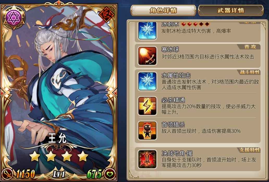 怀着对董卓深深的怨念,王允具有超强力的boss战对策特性:首领猎杀,敌人首领出现时,伤害提高30%!必杀精通的特性配合高爆率的单体法术攻击,是攻略首领副本的良将。即使是放在支援队伍,王允也能在首领战中为队友提升不少战力,可以说是首领的克星。