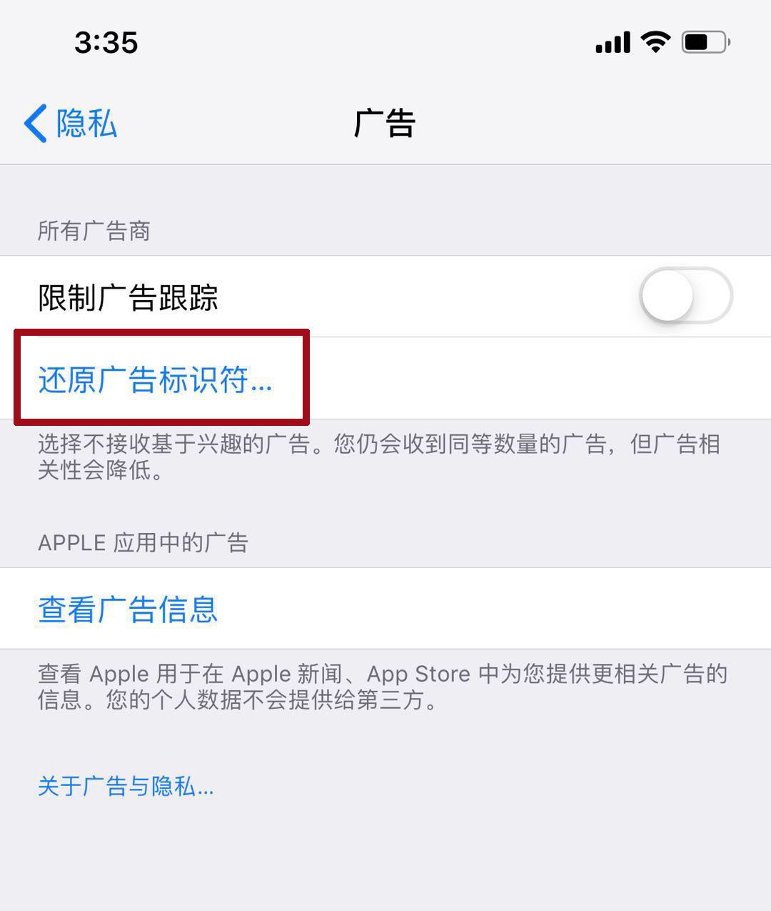 4. iOS同样的位置,将“限制广告跟踪”关闭掉。