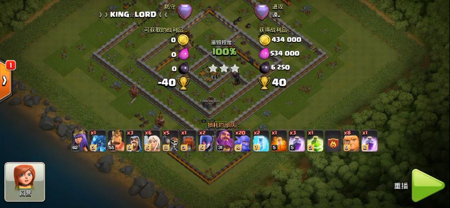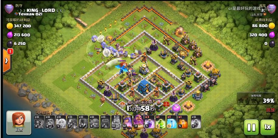 第二步那就是长驱直入了,在女王清边任务完成后我们直接派下攻城战车开道,在坚固的攻城战车后面我们派下所有的蓝胖和我们的大守护者,随后我们走入敌阵内部,敌阵的城堡里的雷龙和气球援军也被我们的毒药法术给处理掉,我们再用冰冻法术和大守护者大招来保护一下我们的大部队,再加上狂暴法术的凶猛加成,我们成功推平敌阵的核心建筑拿下两星。对剩余的建筑,我们选择用弹跳法术来让我们的蓝胖们跳出格子收尾,一段顺利的收尾后我们拿到三星,40杯到手!
