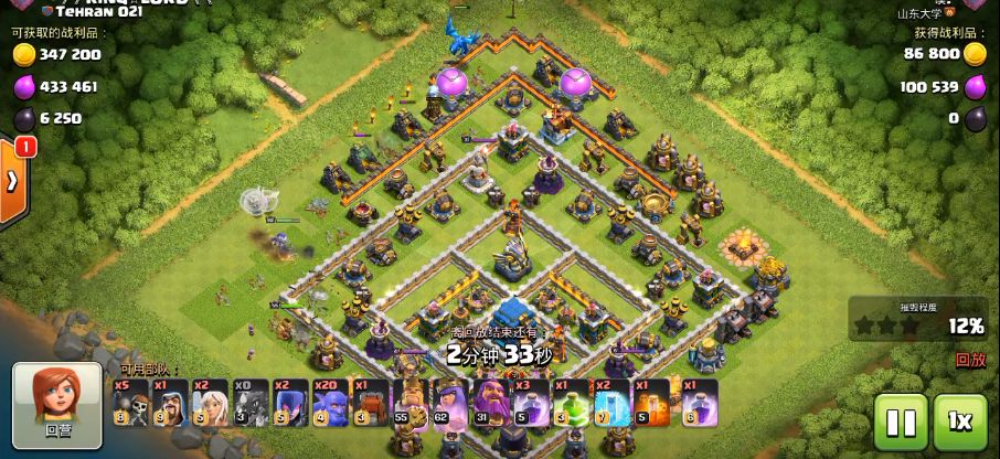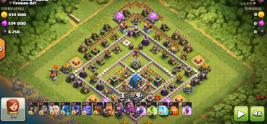 确定好战术后,首先我们在敌阵西北方向开始前戏。先是派出雷龙和双王来进行清边,雷龙很争气的在敌阵北边清掉所有建筑,而蛮王也用技能清掉了敌阵西南方向的所有外置建筑以及敌方蛮王,而天使搭配女王也在雷龙和蛮王的中间疯狂输出清掉了所有外置建筑,我们第一步清边成功。