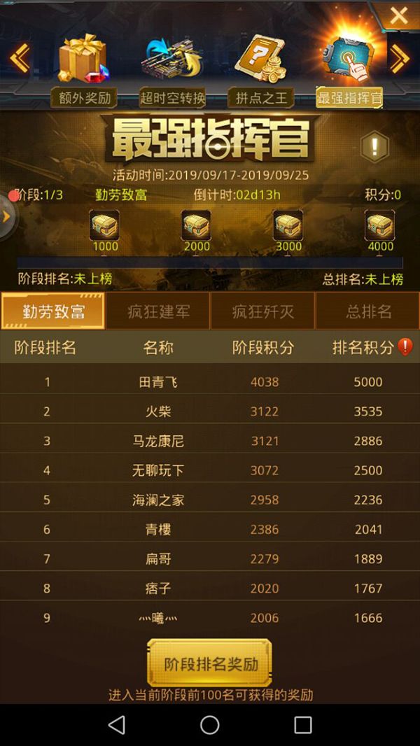 在9天活动中,前8天会分别举行疯狂歼灭、勤劳致富、疯狂建军为主题的3个小活动,每个小活动中,都有阶段奖励,达到分数后可领取奖励。 每个小活动中,都有分榜排行,可争取排行奖励;在第9天,最强指挥官总榜将会算出三个分榜总分下,排名最高的指挥官,获得最终排名奖励;