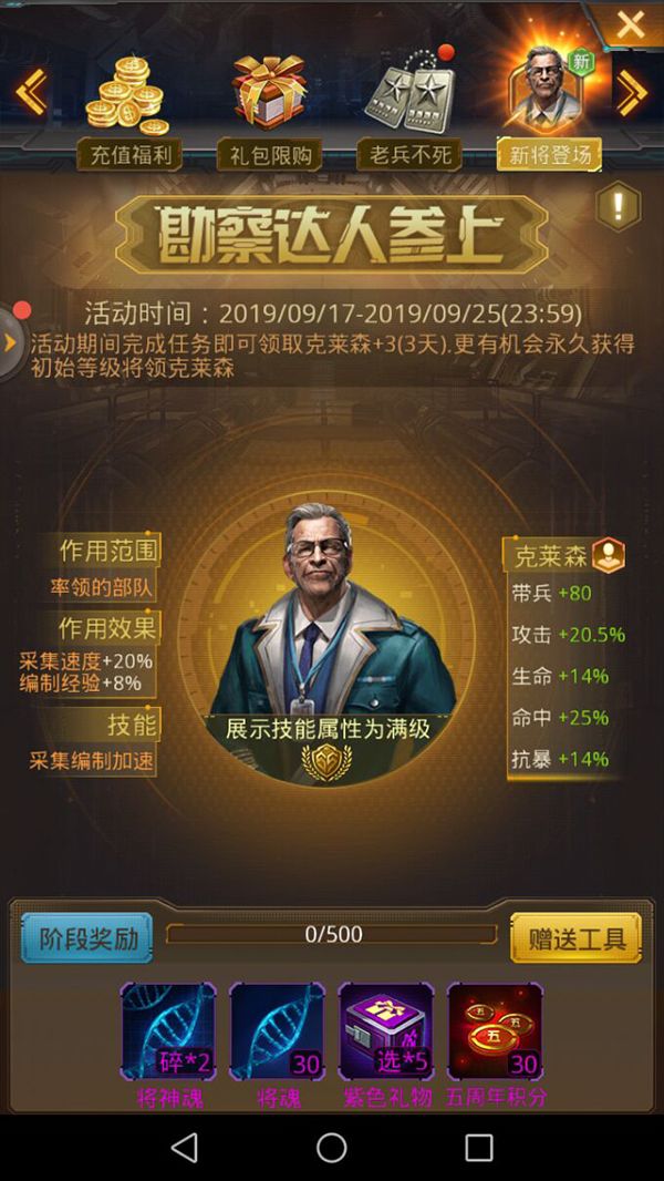 符合老兵不死资格的回归指挥官,享受多重福利!老兵资格指挥官可免费领取强力将领3天试用,之后完成每日活跃后,还能继续试用7天;充值时还有机会额外获得永久的强力将领!