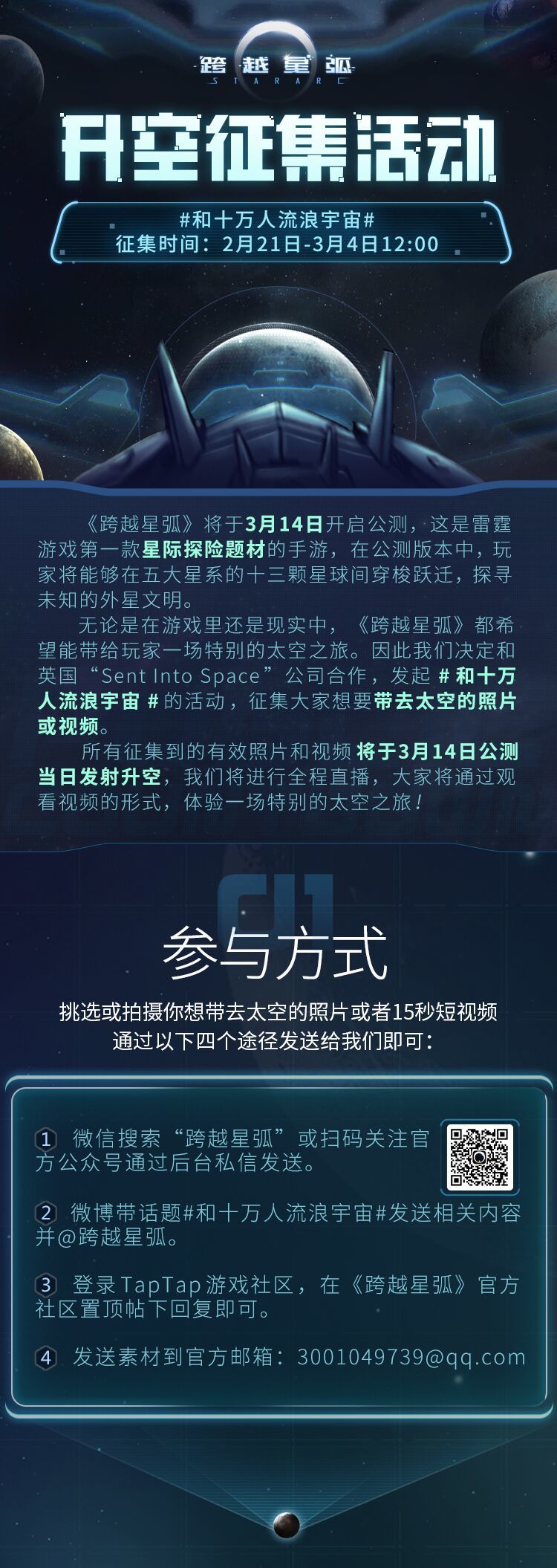 所有征集到的有效照片和视频将于3月14日公测当日发射升空,我们将进行全程直播,大家将通过观看视频的形式,体验一场特别的太空之旅!