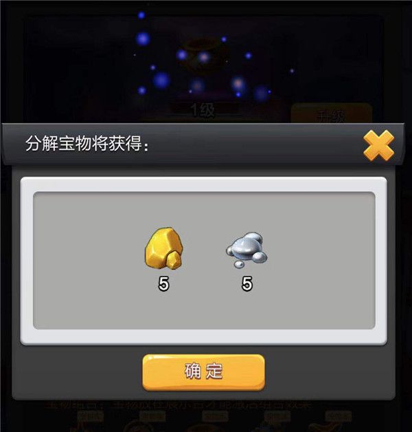 1. 宝物升级材料,当升级宝物时需要用到的素材,根据宝物的不同,所需的材料也不同。分解宝物时,能够根据收藏室等级,按照比例返还对应数量的材料。