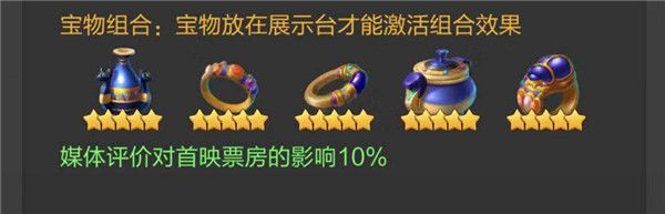 其实熟悉游戏的老玩家们一眼就能看出来,真正有意义的宝物组合就是大家所谓的“首映套”,媒体评价队首映票房影响10%,可惜当前版本该效果并未实装上阵,颇显遗憾。