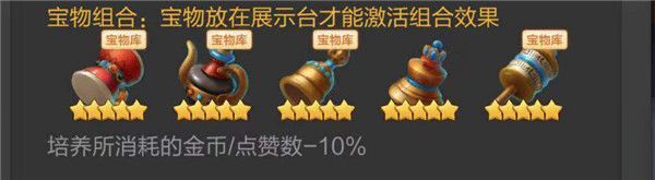 上图中,当集齐一套(五个对应宝物)并置放于宝物台上时,便可激活属性“培养所消耗的金币/点赞数-10%”,具体是否生效实装,Chen因为资源所缺,并没能够为大家实测。