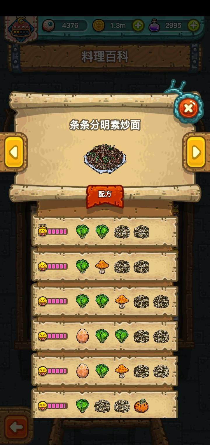 搜了一圈没发现四图高收益的条条分明素炒面满属性配方,所以自己研发了一下,其实大部分研发都是直接在皇冠配方上面加简单的蔬菜等食材