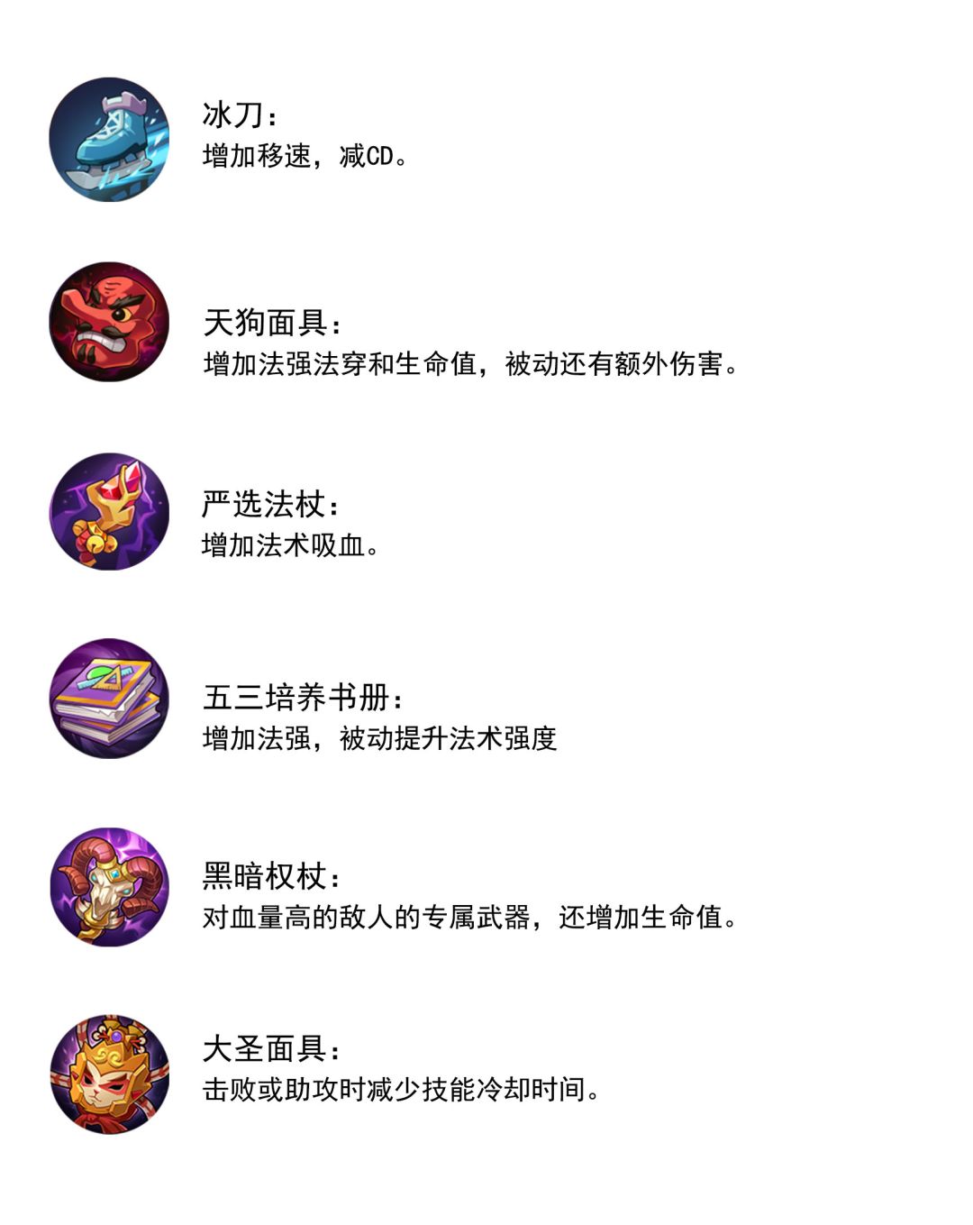 出装及战斗技巧:因为文曲星的主要输出手段是技能,在装备的选择上,主要选择了带法强、法穿和减CD的装备,强化文曲星的伤害,在生存装备上选择了严选法杖来提高续航能力和一些附带生命值的法师装备。