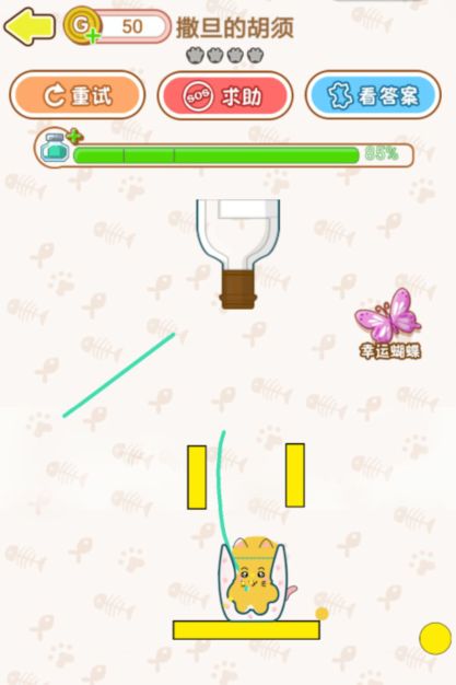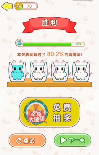 只需要动动你的手指,画出美妙的线条,让酒瓶里的酒倒入指定位置的猫爪杯中,即可过关。