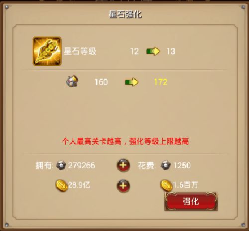 消耗星尘和金币可以强化星石,每强化一次就升级一次,星石强化等级越高,升级所需的星尘和金币就越多,星石品质越高,升级所需的星尘和金币越多。而星石初始是0级,最高可以升到50级。就是要给你们目标,万一达到了呢~