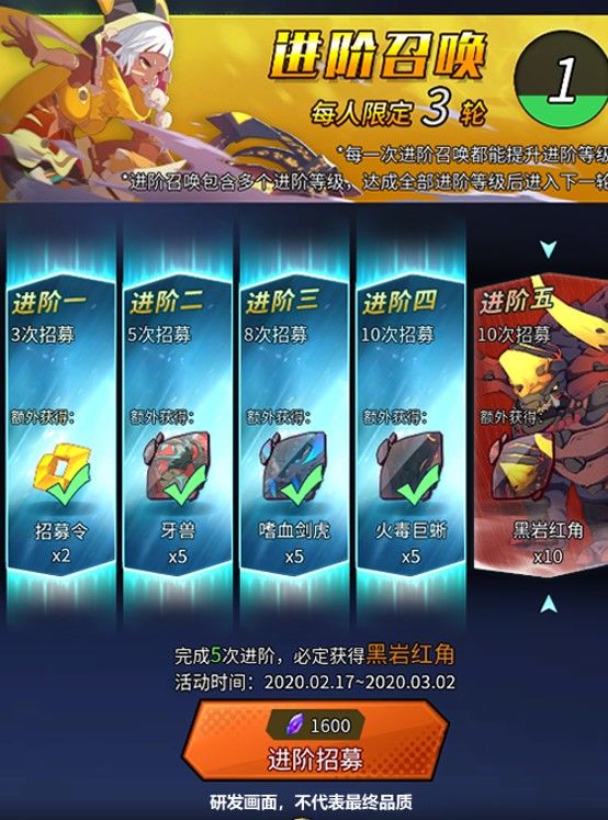 2. 限时招募VI期「黑岩红角」,每完成一轮限时招募可分别额外获得: