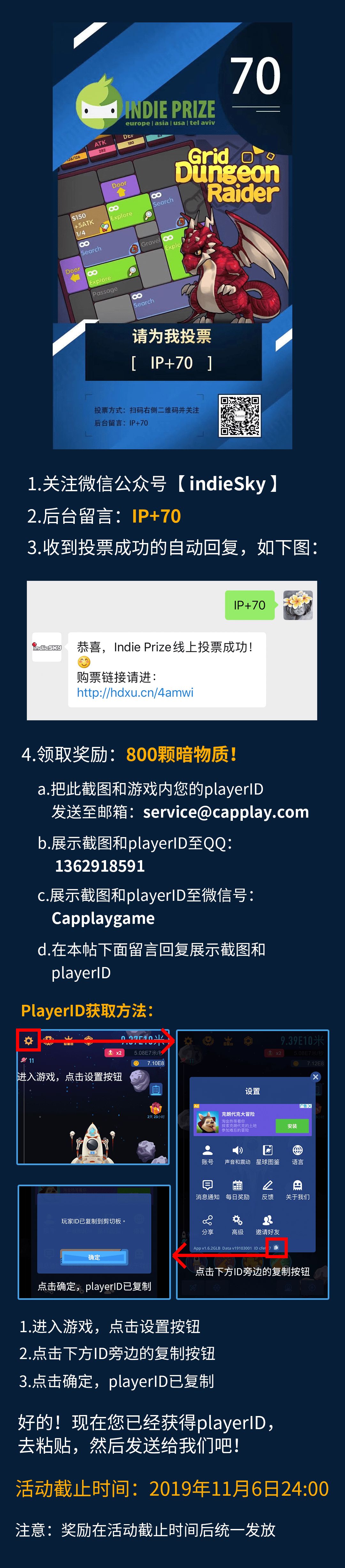 a.把投票成功的截图和游戏内您的playerID发送至邮箱:service@capplay.com
