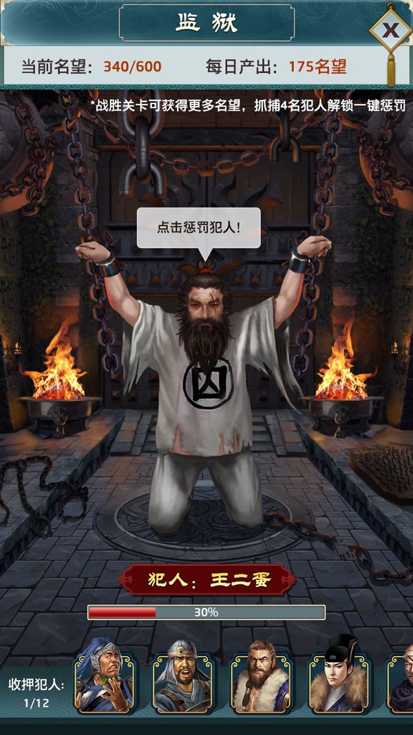 抓获的犯人可以在监狱中进行惩罚,每次耗费10名望,可以获得粮食、金钱、各种丹药、加好感和颜值的道具、元宝、强化卷轴等等。每个犯人被惩罚后扣除的血量不一样,每打光一个犯人的血量才能继续惩罚下一个。而且每个犯人掉落的物品也不一样,越排在后面的犯人掉落的东西越好。名望会在每天凌晨根据你自己的每日产出量(也跟通关数有关)增加,当天剩下也会保留,除非达到上限。