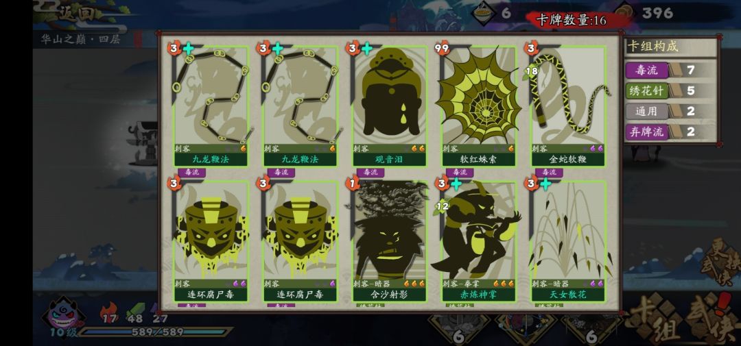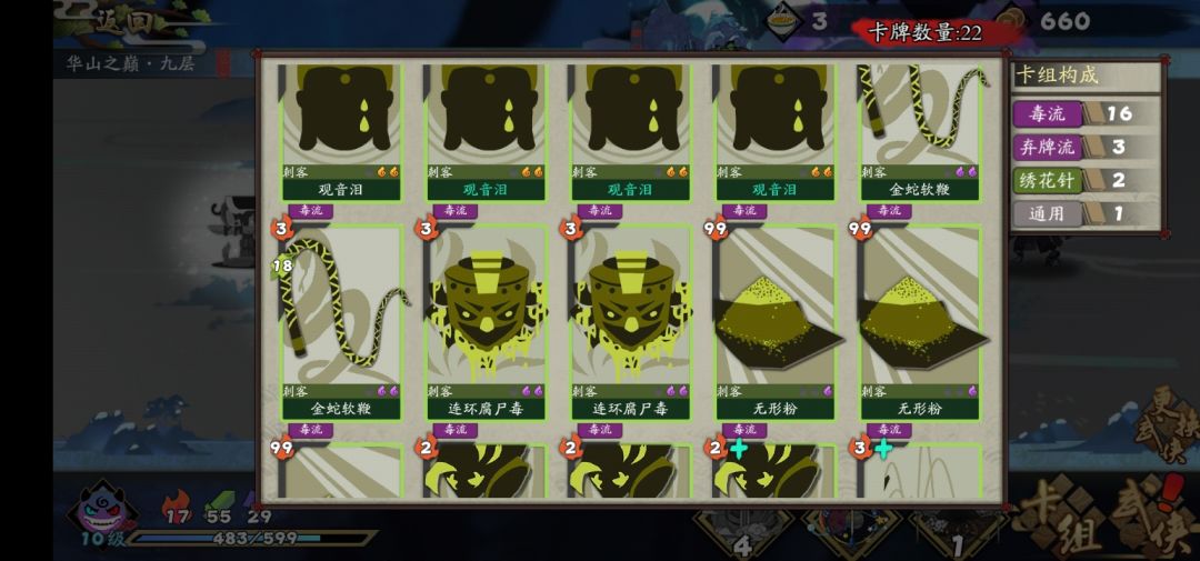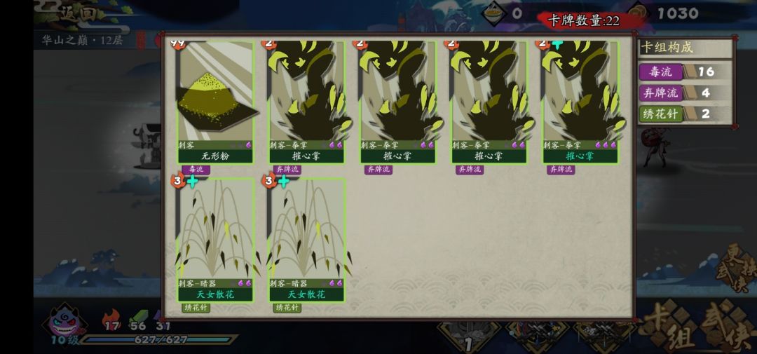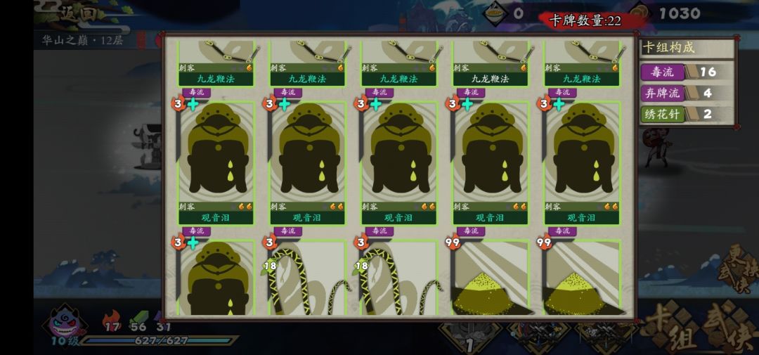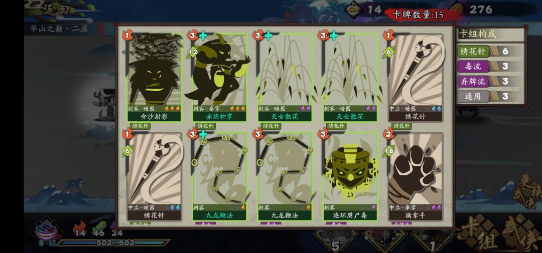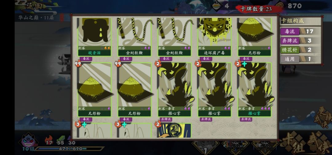 前期先用针流弃牌流度过前期,有九龙一定要拿九龙,还有弃牌抽卡的也能拿,护甲和绣花要第一时间换掉