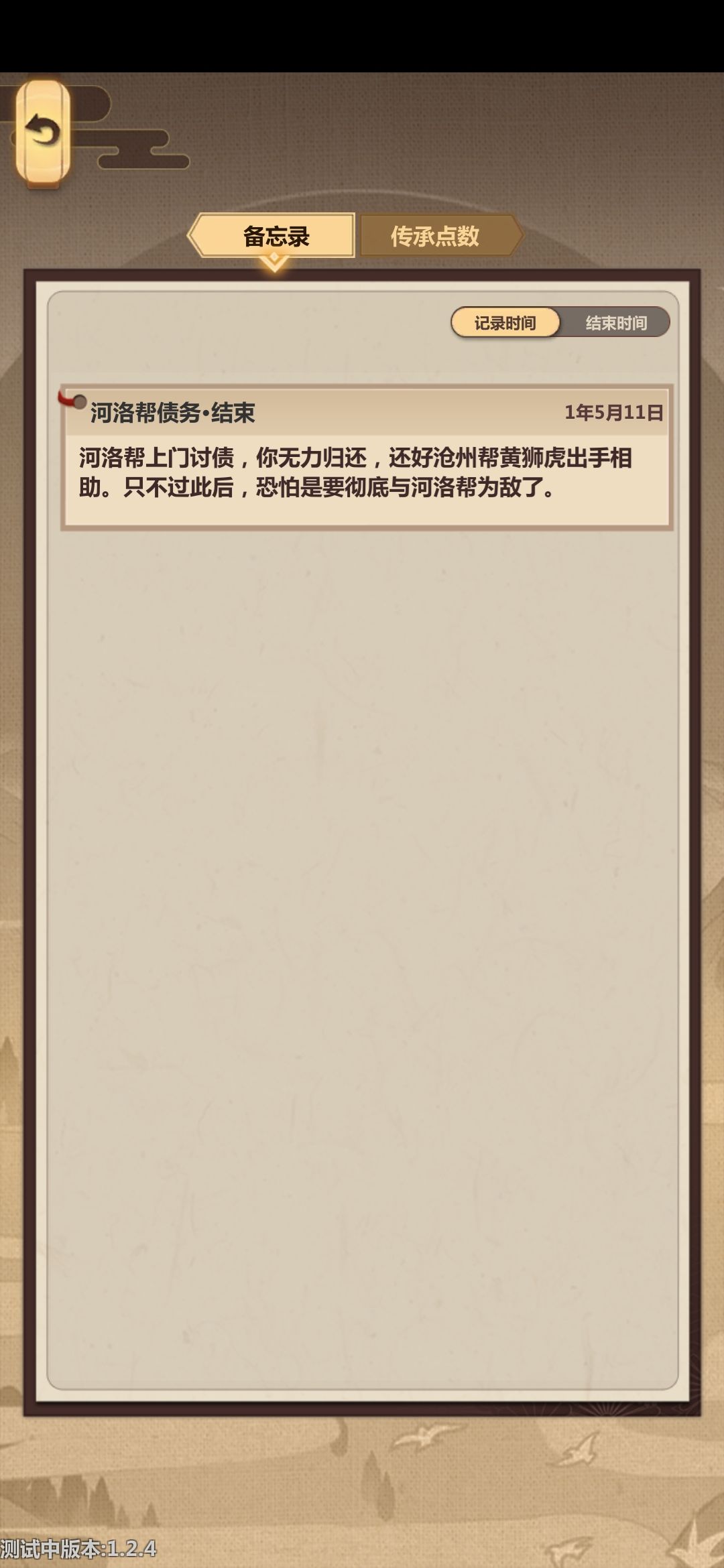 4.加入沧州帮阵营之后黄狮虎赶走了杨秀,备忘界面已经显示债务结束了,但是七月一旬杨秀依旧会在山门收债,不管他会在之后的行侠页面强制结算游戏,给了他后面九月二询还会来,不给他会再重复一遍黄狮虎赶他的剧情,但是九月二询也还会来