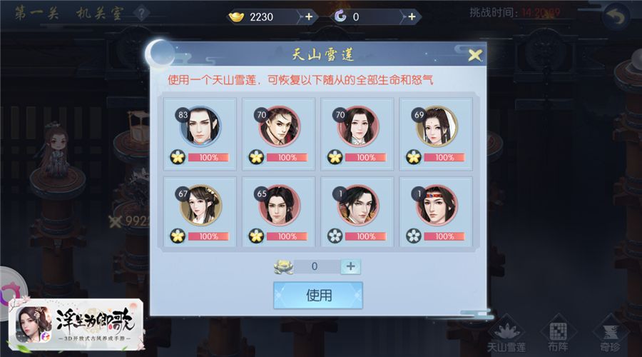 在每场战斗结束后,系统将会记录玩家和敌人双方的血量和怒气值,并代入到下场战斗中,强大的继承机制使整个玩法更加平衡。当然,果玩家认为自身随从的气血及怒气值较低的话,也可以在右下角“天山雪莲”处购买及使用雪莲,所有随从的全部气血和怒气值,在整个活动时间内,一共可以购买3株雪莲。