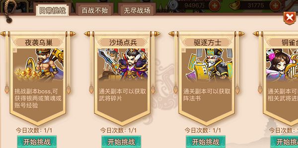 游戏主界面的“副本”按钮点击后可以进入副本系统,副本系统分为三类:日常挑战、百战不殆、无尽战场(具体的在副本篇详细讲解)。“任务”按钮点击后进入游戏任务系统,包括主线任务、支线任务、每周任务、成就任务。完成后可获取大量游戏资源(具体的在任务篇详细讲解)。
