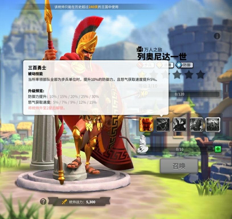 列奥尼达一世的三百勇士提升所率领的步兵单位百分比的防御属性,同时提升所有的怒气来源聚集恢复速度,请千万不要小瞧这个百分比的获取速度,列奥尼达是理论最快将领技能释放速度的最有力竞争人选,搭配天赋情况下,大幅提升了部队经由造成以及受到伤害获取的怒气释放技能,尤其在受到包围情况