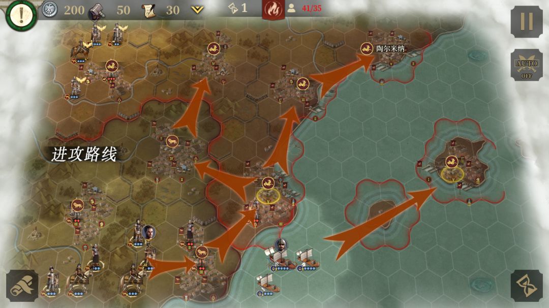 本关目标是击败6支关键部队,击败35支敌军,16回合内达成目标。先按照顺序占领黄圈城,触发海上盟军加入我方控制。然后陆地部队继续杀敌占城,海上还会来几批盟友部队,控制取占领右边的黄圈城,可以拿到2张隐蔽卷轴。击败6支关键部队就过关了,3星注意杀敌数和回合数。
