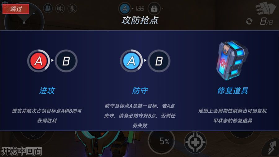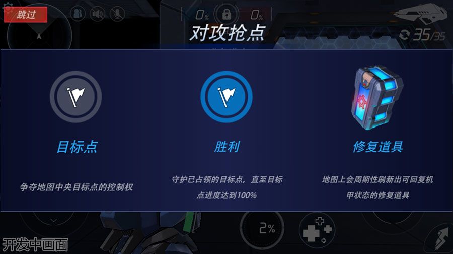两队机甲抢夺地图中央的争夺点并守护它,率先占领到100%进度的队伍获胜。