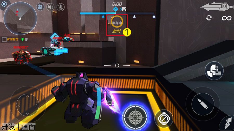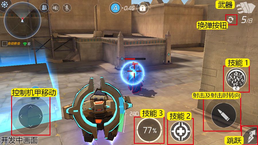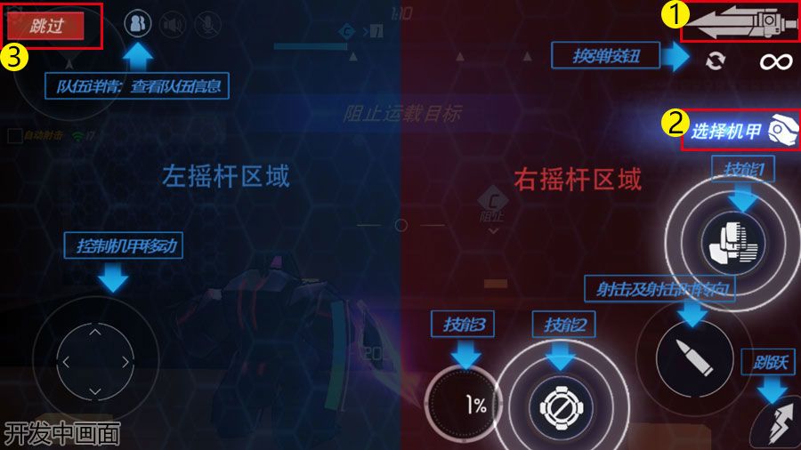 屏幕左半部分是控制机甲移动的区域,右半部分是控制机甲视线、以及射击、技能释放的区域。