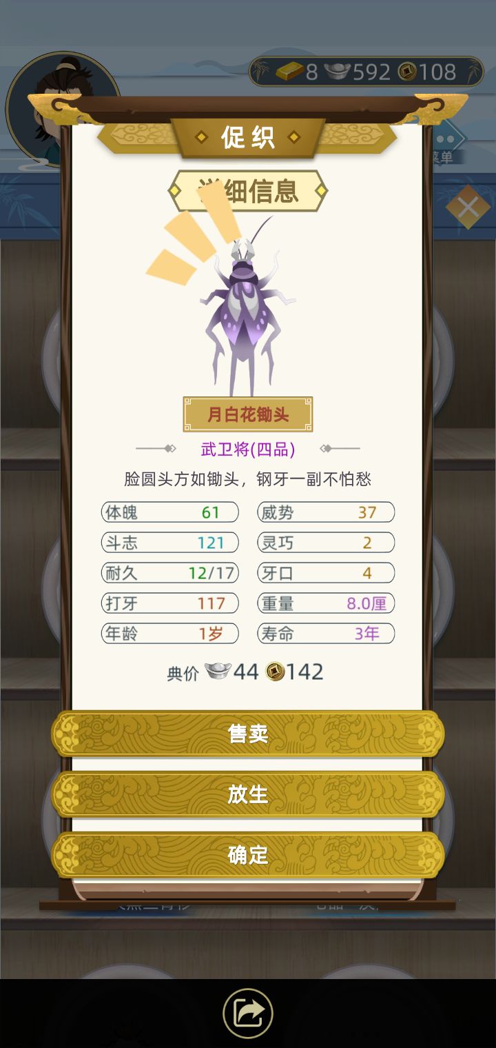 4.蛐蛐的价值会随着年纪增长和耐久度的磨损而贬值。