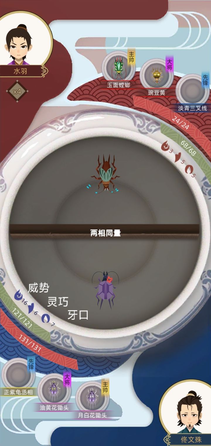 游戏小心得:1.有时,系统会增加难度,遮盖住敌方蛐蛐的样貌和品级,此时只需稍等敌方蛐蛐喊叫,以白色为最次,红色为最优,以叫声判断等级,以此来调整己方三只蛐蛐的作战顺序。