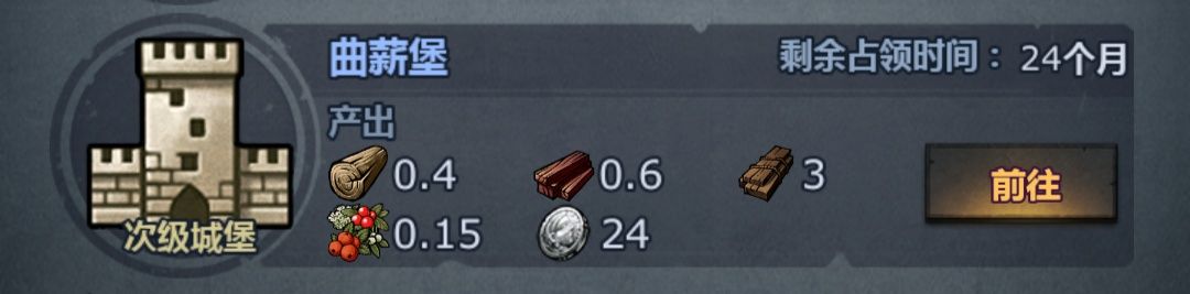 先更一个曲薪堡,为什么呢?因为楼主这里被打了,楼主进去后闪退,成功丢失城堡and 10士气(啊哇哇哇!%–@xO_o)咳咳,正经的,曲薪堡,位于法拉右下角,它的产物在次级城堡中也比较有市场,基本都有用,下面是资料。