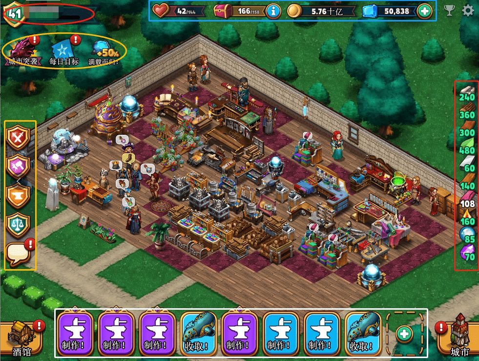 屏幕四边,从中间上部开始,顺时针分别是 个人资产情况、原料备货情况、制作台现状、附属玩法入口。我们一一讲解各模块,最后点明核心玩法的逻辑。