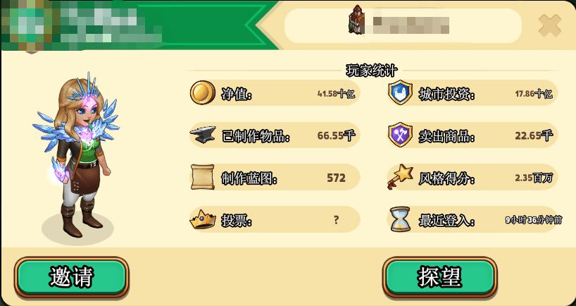 在这里,你可以看到你的角色基础信息,包括你的身价、你的历史制作&卖出商品数量,給家园投了多少钱之类。我理解的,这就是你在游戏中社会地位的直接体现。