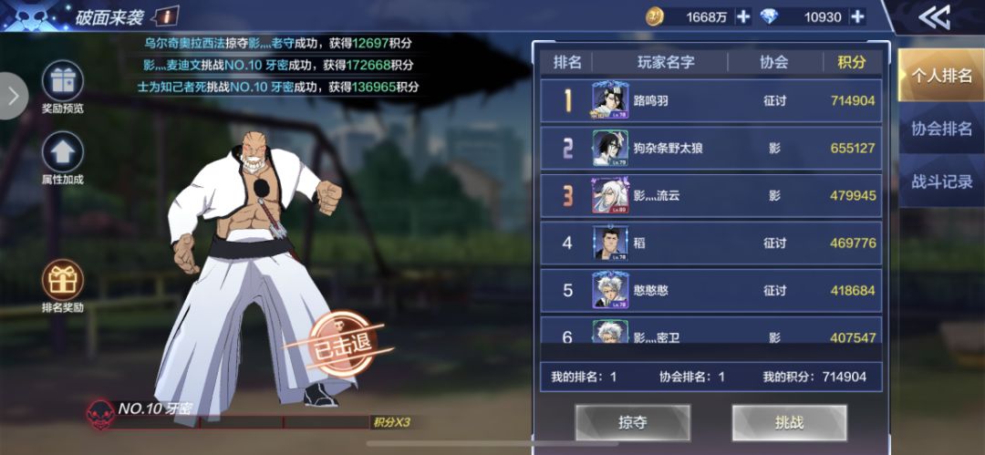 破面来袭一共分为两个部分,挑战与掠夺。这个玩法以PVE为主,最后根据积分情况来确定个人排名以及协会排名。